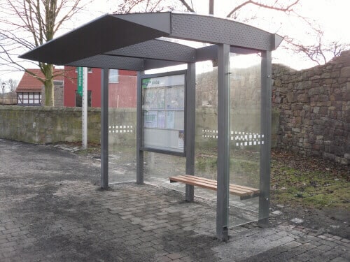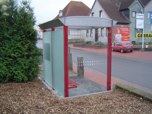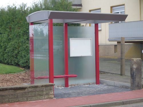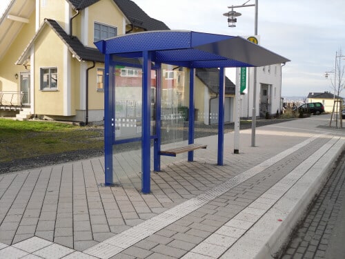 Die Dachdeckung ist aus wetterfestem Kunstglas. Die Wandelemente bestehen aus Einscheiben-Sicherheitsglas und können mit Sichtzeichen oder ähnlichem geliefert werden. Der Wasserablauf erfolgt oberirdisch durch die seitlichen Stützen. Sämtliche Verschraubungen bestehen aus Edelstahl. Eventuelle Ausstattungsmöglichkeiten wie Bänke, Fahrplanvitrinen, Abfallbehälter und anderes Zubehör bieten wir Ihnen auf Anfrage gerne an.