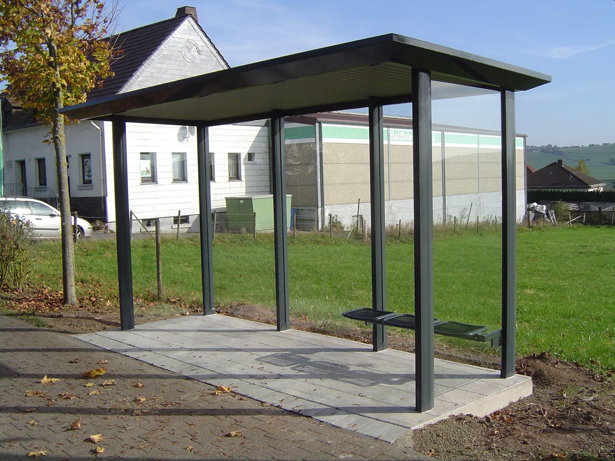 3-feldrige Ausführung als transportable Wartehalle mit oberflächenstrukturierter Beton- Bodenplatte