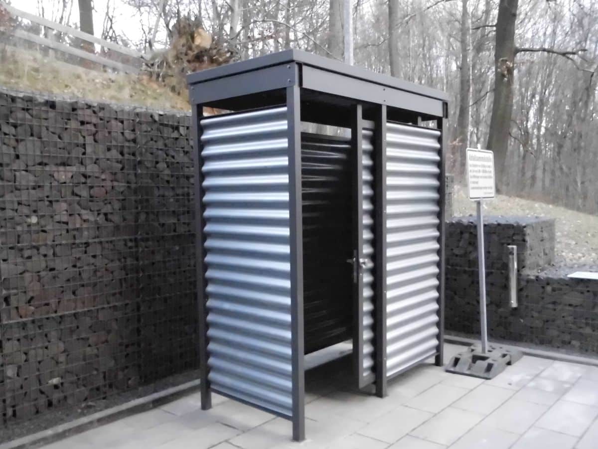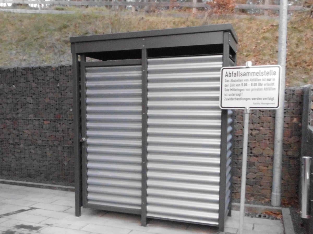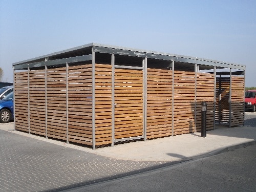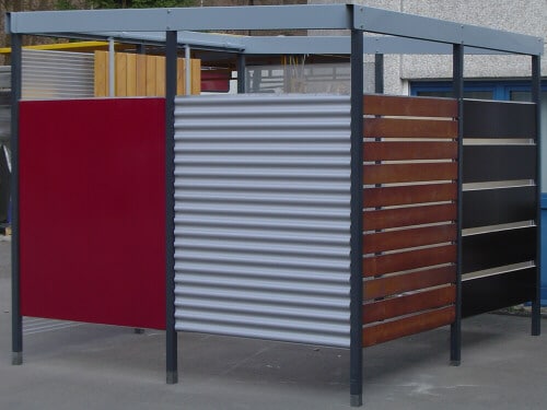 Modulares System – universell einsetzbar als Umhausung – mit oder ohne Dach z.B. für Mülltonnen, Fahrräder, Gartengeräte, Carport und vieles mehr. Verschraubbares Pfosten-/Trägersystem aus verz. Stahl und Wandelementen in verschiedenen Ausführungen mit oder ohne Dach.