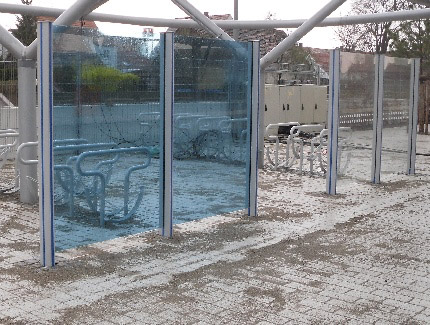 Wandelemente: Einscheibensicherheitsglas, wahlweise mit Scheibendekor oder in verschiedenen Farbtönen. Optional farbige Hochdrucklaminatplatten. Seitliche, zugfreie Befestigung in Nuten des Aluminium-Pfostenprofils.
